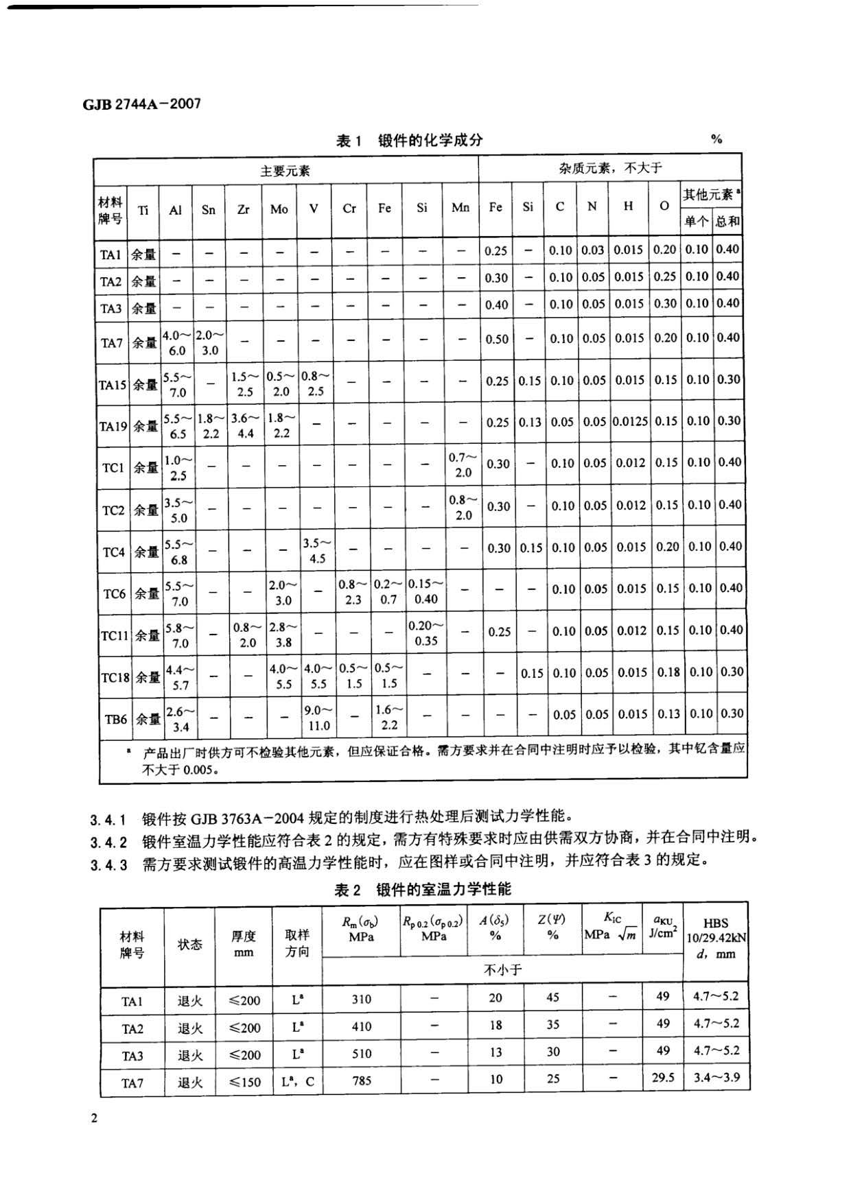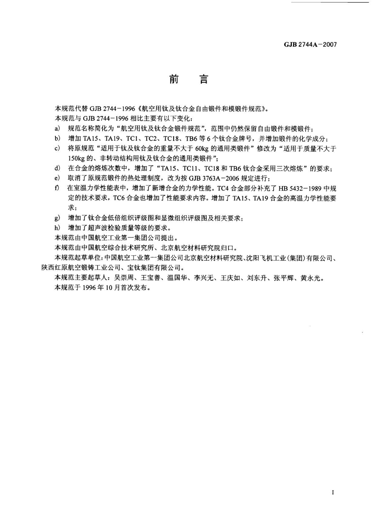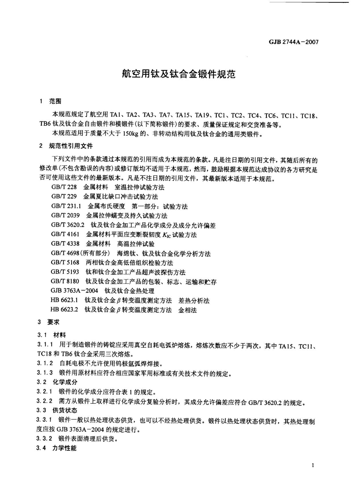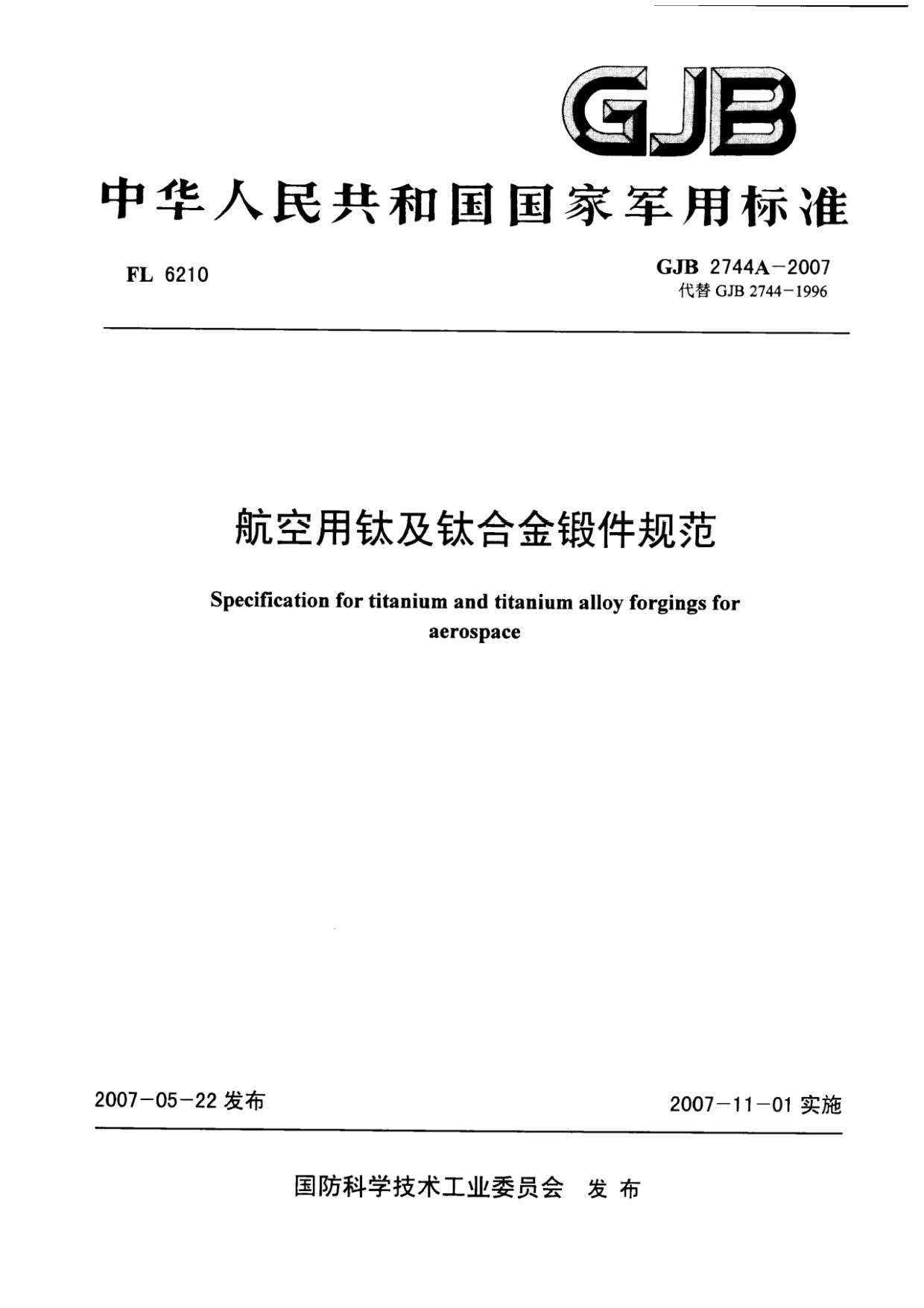 航空用鈦及鈦合金鍛件規(guī)范 GJB 2744A-2007,規(guī)定了TA1、TA2、TA3、TA7、TA15、TA19、TC1、TC2、TC4、TC6、TC11、TC18、TB6鈦及鈦合金自由鍛件和模鍛件(以下簡(jiǎn)稱鍛件)的要求,質(zhì)量保證規(guī)定和交貨準(zhǔn)備等。